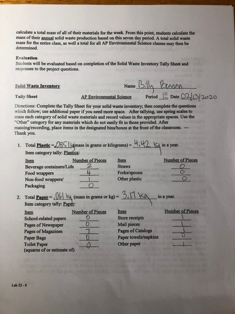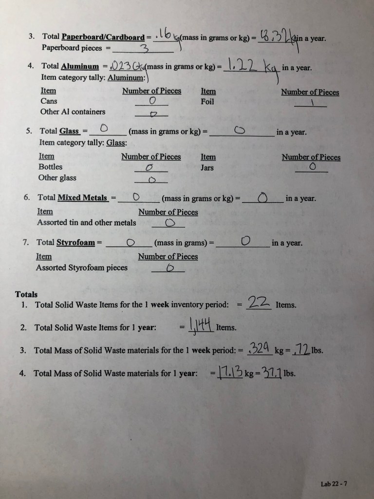 If my parents completed the exact same solid waste project, I believe that they would have a significantly more amount of waste then me. At boarding school, many incentives that limit our usage of packaging and waste are provided for us by Proctor. Options such as serving ourselves during all meals at the dining hall reduces more food packaging than if we were to go to a chipotle or any ordering restaurant. We as students also do not have easy access to grocery stores where we can constantly refill our snacks, resulting in some days, our only food option is that from the dining hall. Although the dining hall consumes food packaging when preparing our meals, buying products in bulk significantly decreases the amount of waste that is being produced. When discussing this topic with my parents, they agreed to my conclusion that they would in fact produce more municipal waste than I. Other than the large amount of food I consume outside of our daily three meals, they said I had an “unfair” advantage because I have access to an all you can eat buffet 24/7 without having to deal with packaging.